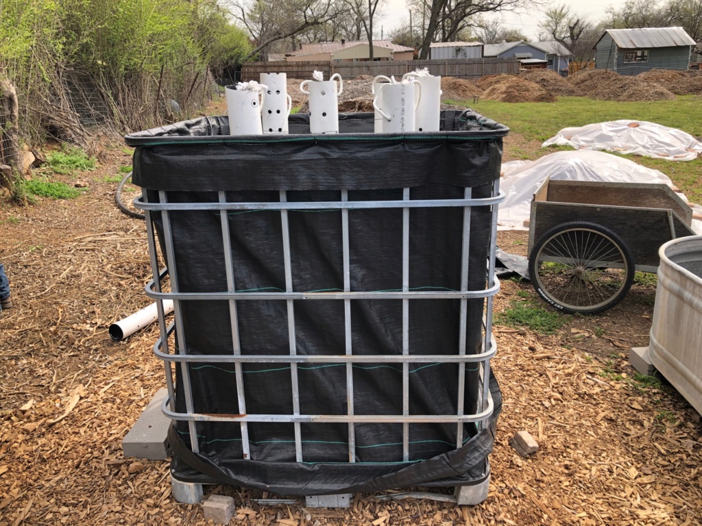 - MATERIALS NEEDED: PVC pipes or hardware cloth, IBC tote cage or concrete re-mesh and wire, landscape fabric or weed barrier, pallet if not using an IBC tote, re-bar (optional)